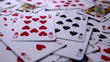 A scattered pack of cards lay on a table filling the frame, random cards drop until the King of Hearts falls onto the top. Shot at 60p on a Black Magic pocket camera.