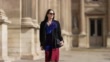 PARIS, FRANCE - MARCH 19: (SLOW-MO) Alba Garavito Torre wears black sunglasses from Ray Ban, large pearls pendant earrings, a pearls necklace, a royal blue electric V-neck short sleeves top from Natan, a black blazer jacket with blue feather brooch, a dark purple / blue / red large striped print pattern midi skirt from Natan, a black shiny grained leather handbag from Chanel, gold bracelets, black shiny leather crocodile print pattern pointed / heels high boots from Amina Muaddi, during a street style fashion photo session, on March 19, 2022 in Paris, France. (Footage by Edward Berthelot/Getty Images)
