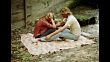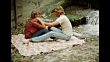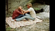 Young adult Caucasian man and woman (couple, blonde '70s hairstyles), seated on blanket beside a small waterfall. He is trying to cheer up the woman who has her head down between her hands. The man uses a small green leaf to tickle her nose. They laugh.Young adult Caucasian male with mustache and long blonde hair standing by a parked yellow van.