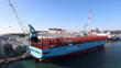 An A.P. Moller-Maersk AS Ane Maersk container ship, powered by green methanol, and a ship under construction in the dry dock at the HD Hyundai Heavy Industries Co. shipyard in Ulsan, South Korea, on Thursday, Jan. 25, 2024.