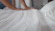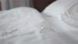 Asian woman cleaning bed arranging blanket and bedding in her bedroom after wake up in the morning time. Record in 50 fps.