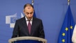 BRUSSELS, Belgium - SEPTEMBER 25: Ukrainian Minister of Infrastructure Oleksandr Kubrakov and the European Commissioner for Transport (unseen) talk to media in the Berlaymont, the EU Commission headquarter on September 25, 2023 in Brussels, Belgium. The latest strikes on Odessa came after three cargo ships docked at the neighboring ports of Chornomorsk and Pivdeny over the weekend. Oleksandr Mykolayovych Kubrakov, Ukraine's deputy prime minister, said the ships were "using a temporary corridor established by the Ukrainian navy to export 127,000 tons of agricultural products and iron ore to China, Egypt and Spain." (Footage by Thierry Monasse/Getty Images)