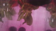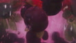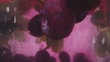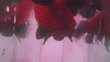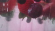 Blueberries and strawberries crash together, mixing beneath water. Shown in extreme close up.