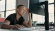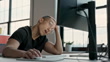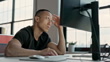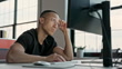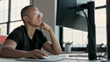 Desk level view of Asian businessman in late 20s wearing eyeglasses and black t-shirt, head in hands, looking at monitor display, disinterested.