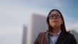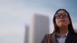 A businesswoman is wearing smart glasses and double tapping on the frame of smart glasses to ask for directions on augmented reality metaverse interactivity space. Smart glasses augmented reality metaverse technology concept.