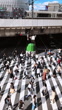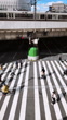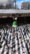 Busy crowded Japanese people, Asian commuter walk cross road at zebra crossing, commuter train on elevated railway in Osaka. Japan transport culture, Asia city life, transportation lifestyle concept