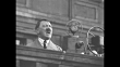 CU Chancellor Adolf Hitler speaking from balcony into microphones / huge crowd below listens