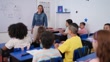 Studenti bambini che fanno domande all'insegnante a scuola - Video stock 4K