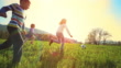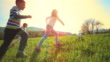 Slow motion wide low angle tracking shot of three children playing football in a meadow on a sunny day. Shot in Slovenia.