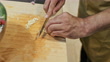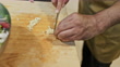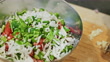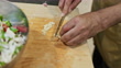 Close-up of man slicing fresh garlic, then adding to white onion, plum tomatoes, and green bell peppers in stainless steel bowl for Spanish-style soup.