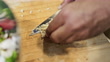Close-up of man using kitchen knife to prepare garlic, then adding it to white onion, plum tomatoes, and green bell peppers in stainless steel bowl.