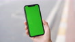 Woman holding smartphone , green screen