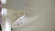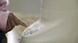 Close-up dolly shot of girl pressing push button on electric mixer in kitchen