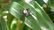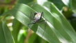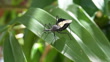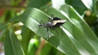 Macro video of a black insect (Assassin bug) Sycanus croceovittatus sitting on a green leaf with blurred foliage in the background. Great for themes of nature, environment, biodiversity, ecology, biology, and educational projects.