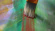 Close up shot of artist holding brush and painting on canvas.