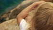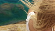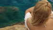 Close up slow motion view of blonde woman's hair flying in wind, view of an attractive girl sitting alone along the coast of Elba Island, Tuscany, Italy.