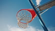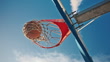 Experience the magic of precision as a basketball makes a graceful descent through the hoop in this captivating closeup directly below shot. Against the canvas of a serene blue sky, the scene unfolds, capturing the essence of a flawless pass. Witness the poetry of motion and accuracy as the ball effortlessly glides through the hoop in a perfect symphony of sport and sky.