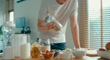 Closeup of young Asian man preparing protein shake at modern home. Diet and healthy food morning routine concept.