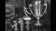 Coach Bernie Bierman, left, Athletic Director Frank McCormick, right, with the men looking at a 'Minnesota/Wisconsin' plaque with an attached football and inscription 'Commemorating Fifty Years of Football' / CU of antique football with 'Minn 6, Mich 6, 10-31-1903' / A large jug, 'M' with historic scores painted on the side, two matching silver trophies of three running players; 'National Italian American Civic League Trophy' / The 'Toledo Cup' trophy with two handles for winning three national championships in a row 1934-1936 / A pig trophy, 'Floyd of Rosedale' / A pan of all the trophies / Note: exact day not known