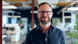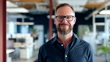 Close-up portrait of confident mature businessman standing in startup office. Successful male professional looking at camera and smiling at work.