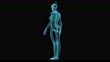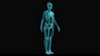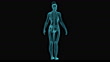 A digital holographic model of a female skeleton with a full-length X-ray, rotating 360 degrees around its axis, looped animation. A three-dimensional model of the skeleton is made of digital dots and particles, a human X-ray is visible on top of the skeleton. Digital modern medicine. Medical scanner MRI scan of the human body.