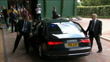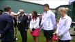 Duchess of Cornwall visit to Wimbledon; ENGLAND: London: WimbledonEXTCamilla, Duchess of Cornwall (wearing white, biscuit spotted dress and biscuit jacket) arriving out of car and into building INTCamilla meeting with ball boys and girls / Camilla meeting with service personnel / Camilla meeting military personnel acting as stewards at Wimbledon / Camilla talking with Laura Robinson (Tennis player) / Camilla talking to Milos Raonic (Tennis player) / Camilla talking to finalist Sabine Lisicki (Tennis player) in ladies singles from last year / Camilla along to continue tour