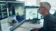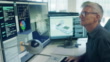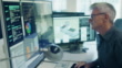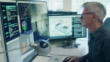 Stock 4K movie clip, with dolly movement, of a mature man working on a CAD design of an Eco house with associated data on screen.