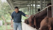 Farmer working at cattle farm, caring for cows in livestock barn. Concept of agriculture, animal husbandry, rural lifestyle, and sustainable farming with focus on livestock care and management.
