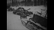 VS Finnish soldiers examine a tank riddled with bullet holes; one jiggles a gun sticking outside the turret, and another opens the hood / VS three men with rifles walk alongside other abandoned vehicles; one stacks small parcels / VS A long roadway deep in snow with more vehicles including carts, wagons, a sleigh, mounds of spilled crates and improvised shelters / Tall chimneys of a destroyed factory / VS a long line of Finnish solders on skis / Oval sign: "Suomussalmi" / Note: exact day not known