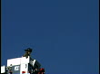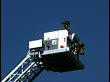 Medium shot as a firefighter controls and moves the ladder up against a blue sky.