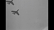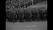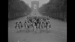 Title card: " France Forgets Troubles on Bastille Day" superimposed over marching cadets / CU army cadets, rifles on shoulder march past camera / ZI Algerian troops (Spahis)on horseback ride down Champs-Elysees toward the camera, Arc de Triomphe in background / flag bearers of different colonial regiments march down street / MS President Guy Mollet and two other French officials stand in viewing box, other officials are behind them / ZI paratroopers march down the Champs-Elysees / Aerial troops march through Place de la Concorde, partial show of Eiffel Tower in the background / MS armored cars drive down Champs-Elysees toward camera / jets fly in formation overhead / POV side view from another plane, four jets fly in formation / four jets fly below camera / side air view jets fly / twelve jets fly overhead
