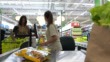 Friendly cashier registering products with bar code reader at a supermarket checkout to female customer both smiling