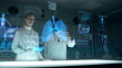 Holographic models with human lungs. Futuristic laboratory interior with data on screens. Caucasian female doctor working woth African ethnicity doctor