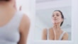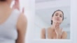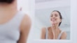 4k video footage of an attractive young woman looking at herself in the bathroom mirror at home