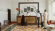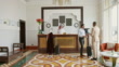 Slow motion view of businesspeople in 20s and 30s checking-in with receptionist and conversing in elegant interior with Islamic design features.