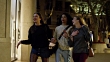 Dolly shot of happy women talking while walking on sidewalk. Female friends are enjoying nightlife in city. They are in warm clothing.