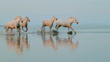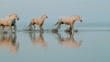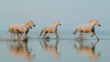Super slow motion shot of a herd of horses running in shallow water on the beach. The Camargue National Reserve. France. Europe.