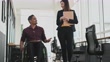 Uomo d'affari indiano in sedia a rotelle che cammina con una collega che discute sul posto di lavoro - Video stock 4K