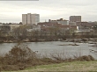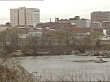 DANVILLE, VIRGINIA: WS Industrial buildings Dan River FG, cars and trucks passing on highway behind trees.