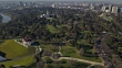Aerial view of the Kings Domain parkland in central Melbourne, featuring the Royal Botanical Gardens, the Myer Music Bowl, Government House, and the Shrine of Remembrance.