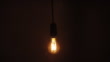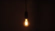 A single retro styled modern low energy lightbulb gently moving from backward and forward against a black background.