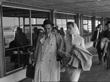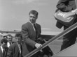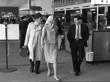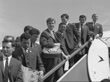 London Airport departures; ENGLAND: London: LAP (London Airport):INTMS Lauren Bacall and Mr Jason Robards past:MS Ditto - past:EXTCS Lauren Bacall up steps to BV with Mr RobardsMS FA team up steps (England football team)CU Tom Finney, player-manager:MS Team pose on steps:NEG: 16mm: BRENARDS: