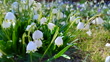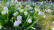 Day time close up of spring flowers white snowflakes swaying on gentle wind with green grass.