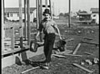 B/W 1924 man with buckets at construction site getting hit on head by falling hammer / short - Video stock