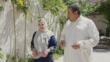 Middle Eastern man and woman in traditional attire approaching camera from secluded patio area into sunshine, talking and laughing.