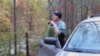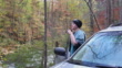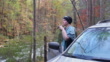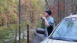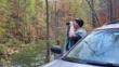Matura donna ottimista e positiva al corpo che esplora la foresta nazionale di Nantahala con il binocolo, in piedi accanto all'auto. - Video stock 4K