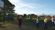 A wide shot of a group of diverse mature women enjoying an outdoor netball session on a sports court during a cold sunny day. The women are lining up to throw a red netball into the hoop while smiling. They are dressed in warm sports clothing on a sunny winter's day in Northumberland, North East England.