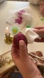 A vertical top-down video captures the delicate process of removing one of the beeswax layers from a handmade pysanka egg. A female hand in a traditional embroidered Ukrainian blouse carefully holds the egg near a lit candle, melting the wax to reveal the intricate design underneath. The scene unfolds over a charmingly messy table filled with crafting tools and materials—color-stained paper napkins, printed samples of traditional patterns, and a visible box with “З Пасхою!” (“Happy Easter!” in Ukrainian). The flickering candlelight and organic disarray create an authentic, intimate glimpse into the art of pysanka making.