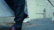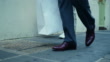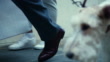 Close up of two men and Wire Fox Terrier walking down a street in London, England.