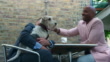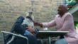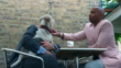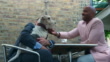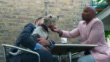 Mixed race homosexual couple sitting at a table at an outdoor cafe, having lunch in London, England.